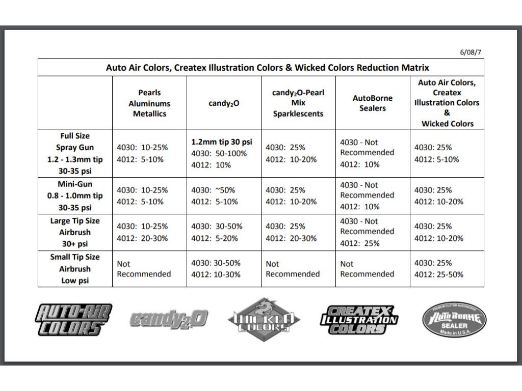 Se adaugă direct în vopsea sau în diluantul 4012. Menține un flux constant de vopsea în timpul pulverizării. Ajută la menținerea consistenței și integrității vopselei în timpul uscării. După uscare, vopseaua este solidă și durabilă. Nu poate fi îndepărtată, de exemplu cu o radieră electrică. Pulverizarea finală este satinată mată. Poate fi utilizată cu toate mărcile de vopsea Createx (createx, cre.illustration, wicked, auto air, candy O2 etc.). Se adaugă într-un raport de 25% din volumul vopselei.