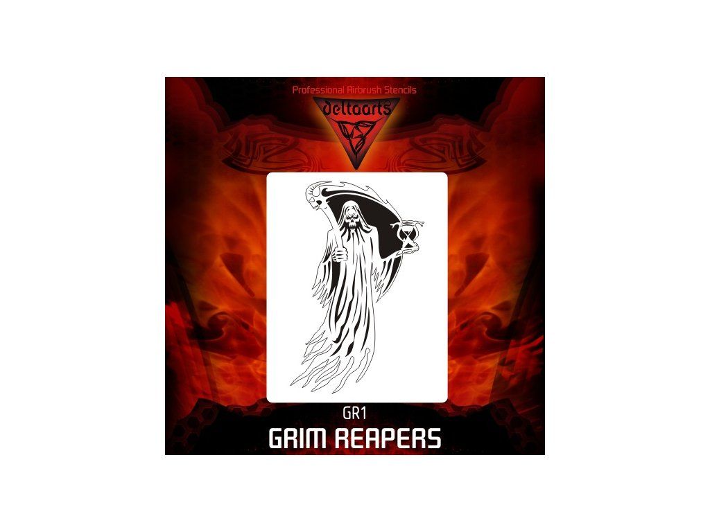 Șablon pentru aerograf Grim Reapers. Decupat din folie mylar cu grosimea de 0,2 mm. Set de 2 șabloane. Dimensiuni: 339 x 194 mm.