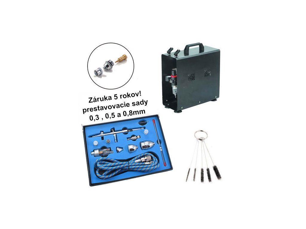 Set universal de aerografuri potrivit pentru vopsirea pereților, dar și pentru diverse alte tipuri de vopsire - pe alimente, pe corp, pentru modelatori, artiști, cofetari, pe textile și altele asemenea. Setul este potrivit în special pentru modelatori și aerografiști începători. Dacă vă place tehnologia de înaltă calitate la un preț bun, acesta poate fi utilizat și pentru torturi, unghii, textile și alte aplicații. Setul include: - 1x compresor AS-186A (compresor acoperit cu 2 suporturi pentru pistol, original Fengda, garanție de 3 ani) - 1x pistol Eskair sk-183K (include pistol cu duză de 0,3 + kit de reglare de 0,5 și 0,8 mm + furtun de 1,8 m + CONECTOR RAPID, MINI FILTRU, garanție de 5 ani)- 1x perii de curățare BD-430
