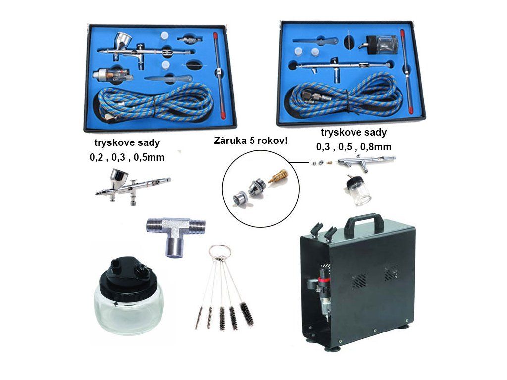 Set profesional pentru pictură mai exigentă, mai îndelungată și de calitate superioară, pictură pe corp, pictură pe alimente, pictură pe imagini, pentru saloane de înfrumusețare și similare. Potrivit pentru diverse tipuri de pictură. Setul include un pistol de pulverizare cu umplere superioară cu 3 dimensiuni de duze și un pistol de pulverizare cu umplere inferioară cu o duză de 0,7 sau 0,5 mm pentru suprafețe mai mari. Setul include: 1x compresor AS-186A (compresor Fengda acoperit de 3,5 bari cu 2 suporturi pentru pistol de pulverizare, garanție de 3 ani)- 1x compresor AS-186A (compresor Fengda de 3,5 bari cu carcasă, 2 suporturi pentru pistol, garanție de 3 ani) - 1x set pistol Eskair sk-180k (include un pistol cu duză de 0,3 + set de reglare 0,2 și 0,5)- 1x set pistol Eskair sk-180k (include un pistol cu duză de 0,3 + kit de reglare de 0,2 și 0,5 mm + furtun de 1,8 m + cheie. Toate acele sunt lustruite, garanție de 5 ani)