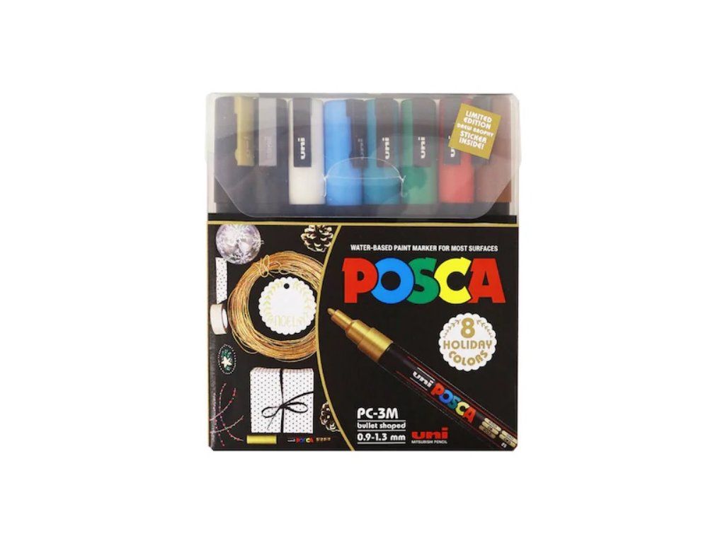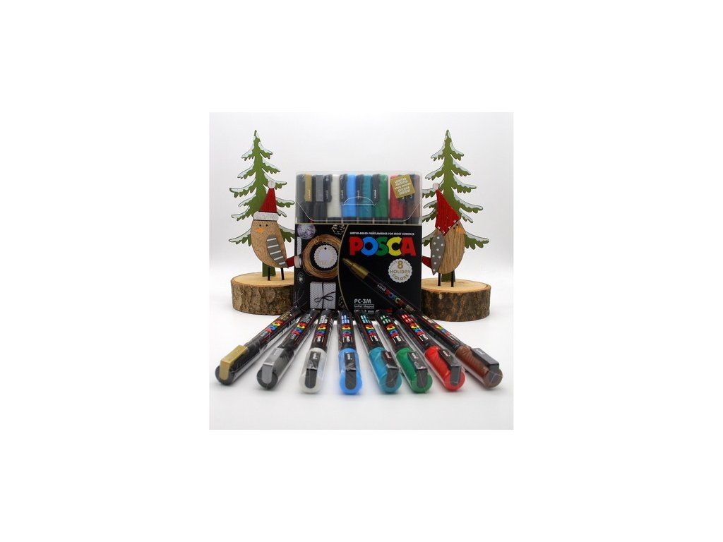 Set de 8 markere POSCA 3M pentru sărbători. Setul include următoarele culori: auriu, argintiu, alb, albastru deschis, verde smarald, verde, roșu, maro.