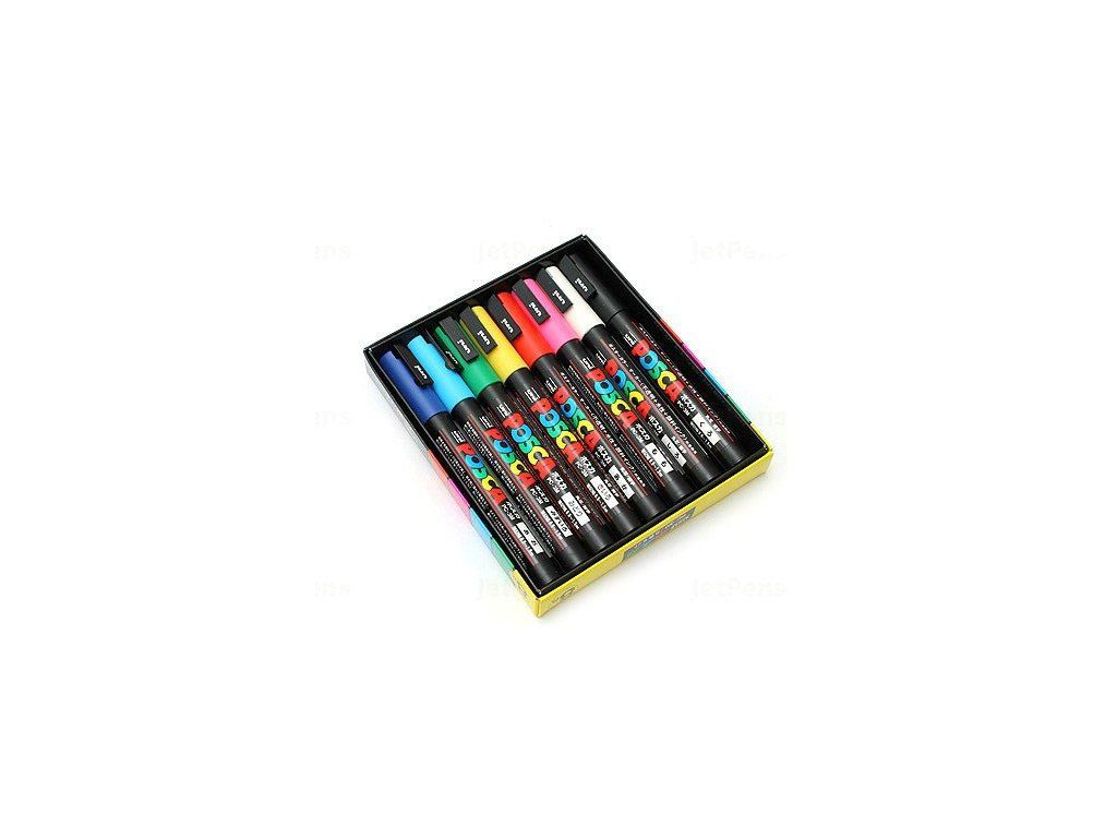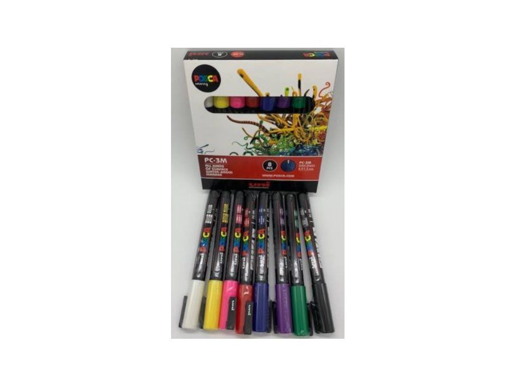 Set de 8 markere POSCA 3M classic. Setul include următoarele culori: alb, galben, roz, roșu, albastru, violet, verde, negru.