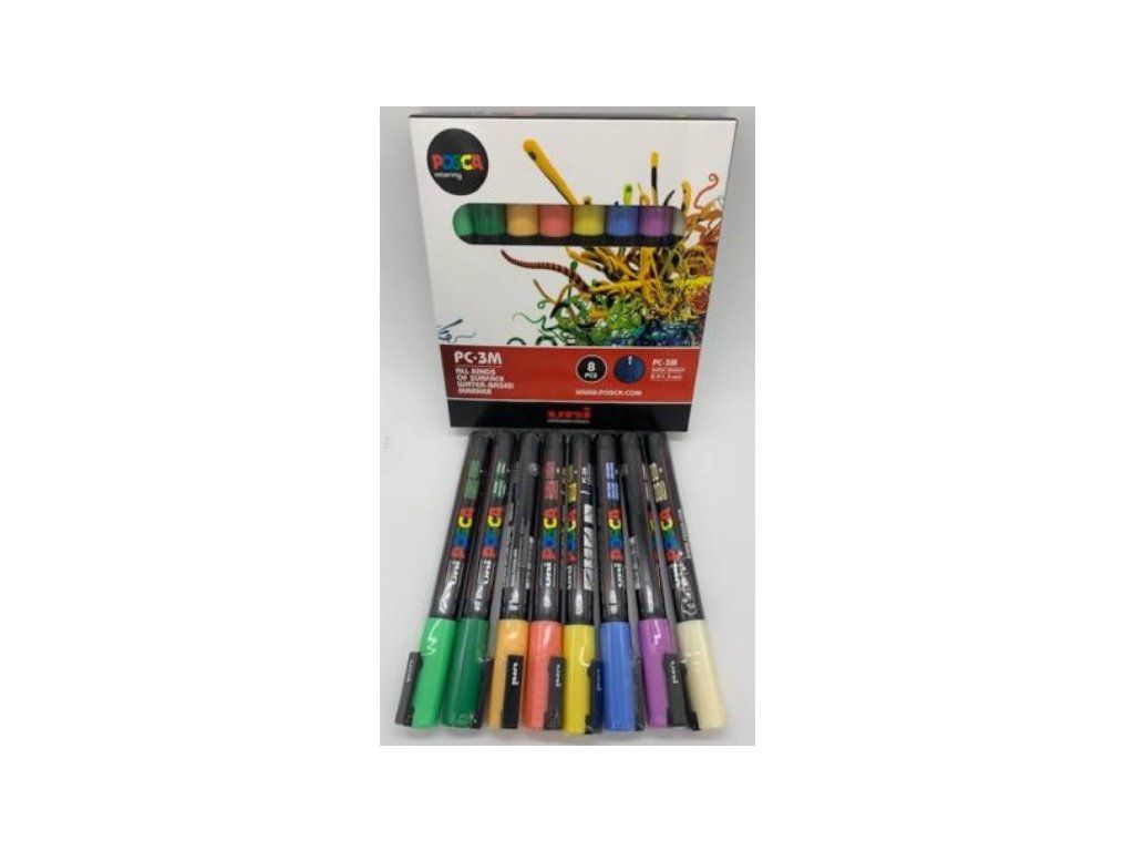 Set de 8 markere POSCA 3M pastel. Setul include următoarele culori: verde deschis, verde, caisă, roz coral, galben, lavandă, albastru cer, fildeș.