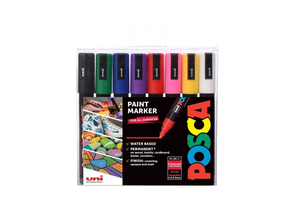 Vârful mediu este cel mai versatil din întreaga gamă. Oferă o linie clară și precisă în cea mai largă gamă de culori. Este utilizat de artiști și profesioniști, precum arhitecți și designeri, precum și de amatori pentru a-și realiza ideile. Poate fi utilizat și în designul interior. Mai mult, datorită versatilității sale, este ideal pentru începătorii care doresc să înceapă să creeze cu POSCA. Setul conține 8 markere PC-5M în culori de bază.